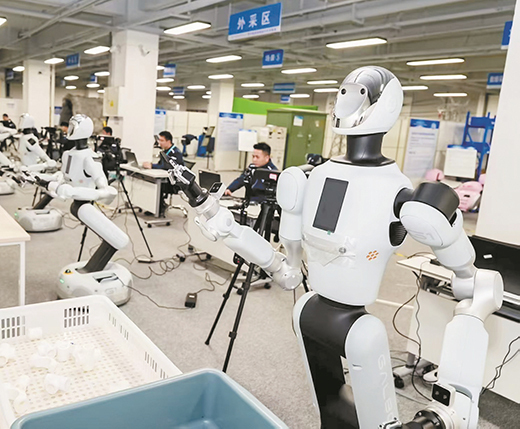 广西东盟具身智能中试训练场里,工作人员在调控训练机器人。该中试平台能缩短技术落地周期,加速科技成果转化。