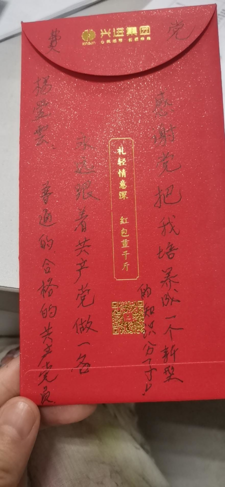 “感谢党把我培养成一个新型的知识分子!永远跟着共产党做一名普通的合格的共产党员。”旧红包背面,生性节俭的杨爱云用娟秀字迹写出了对党的心声,也写出了她用一生来践行的一名共产党员的初心与使命。